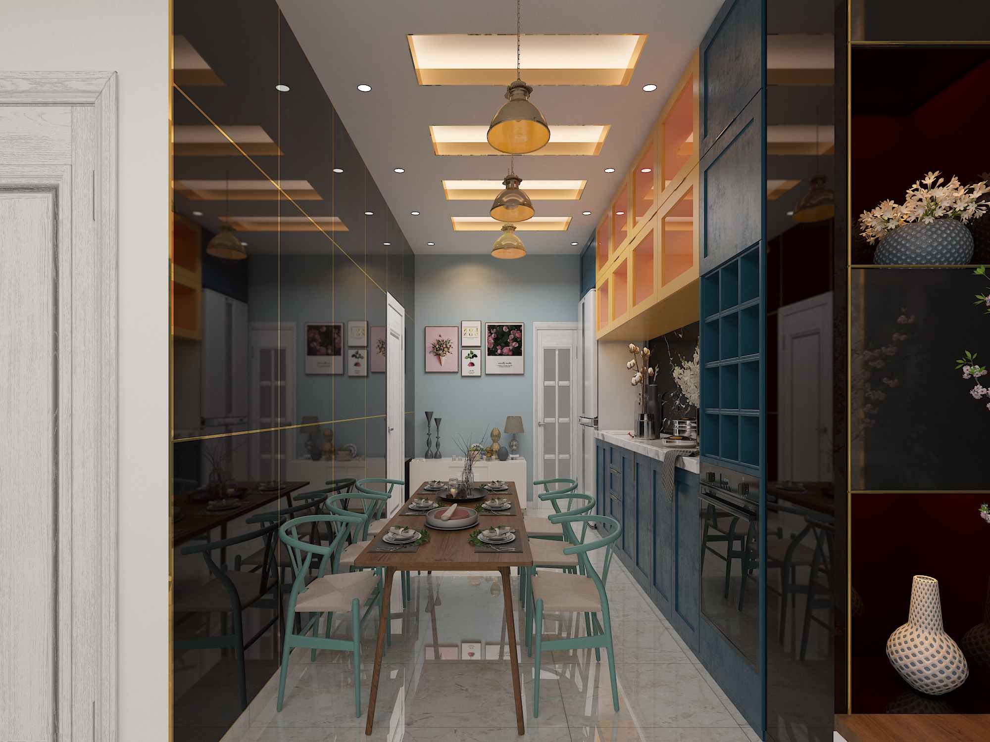 Nội thất bếp sang trọng với gam màu xanh hợp phong thủy với gia chủ đem đến tài lộc và sức khỏe.