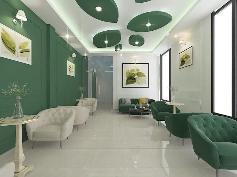 Tầng 2 thể hiện mùa xuân màu xanh lá, trần trang trí những chiếc lá xanh rất nổi bật trên nền trắng.