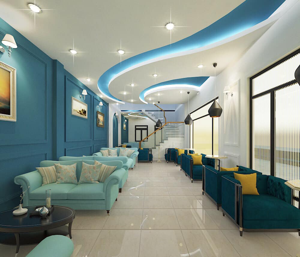 Công trình gồm 4 tầng thì 3 tầng dưới chủ đầu tư sử dụng làm quán cafe còn tầng trên cùng cho nhân viên sử dụng, mỗi tầng được thiết kế theo một màu khác nhau. Yêu cầu chủ đầu tư muốn nội thất quán thiết kế theo mùa nên kiến trúc sư chúng tôi đã thiết kế tầng 1 mùa đông, tầng 2 mùa xuân, tầng 3 mùa hạ. Tầng trệt được sơn màu xanh biển trần uốn lượn như dòng nước.