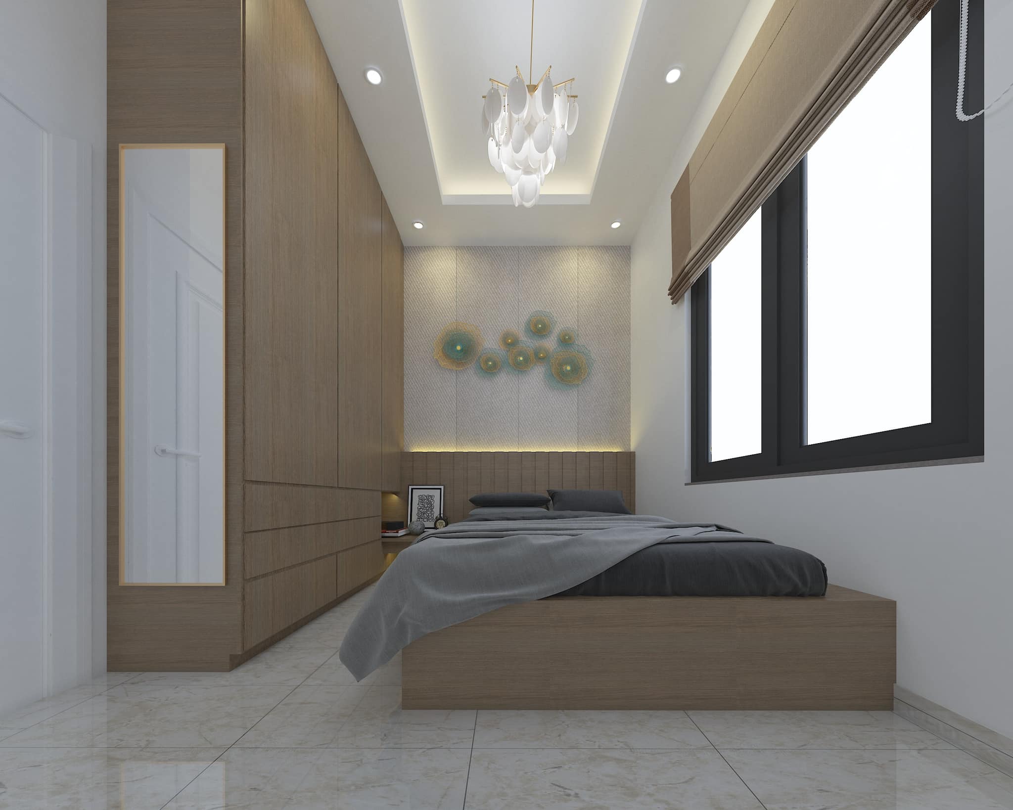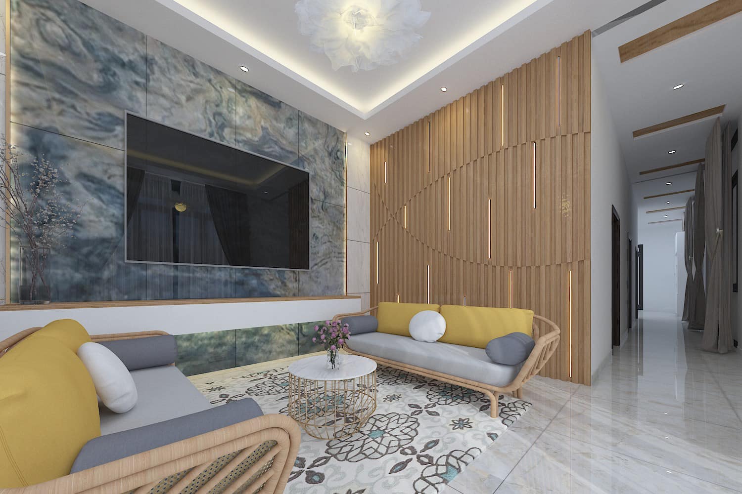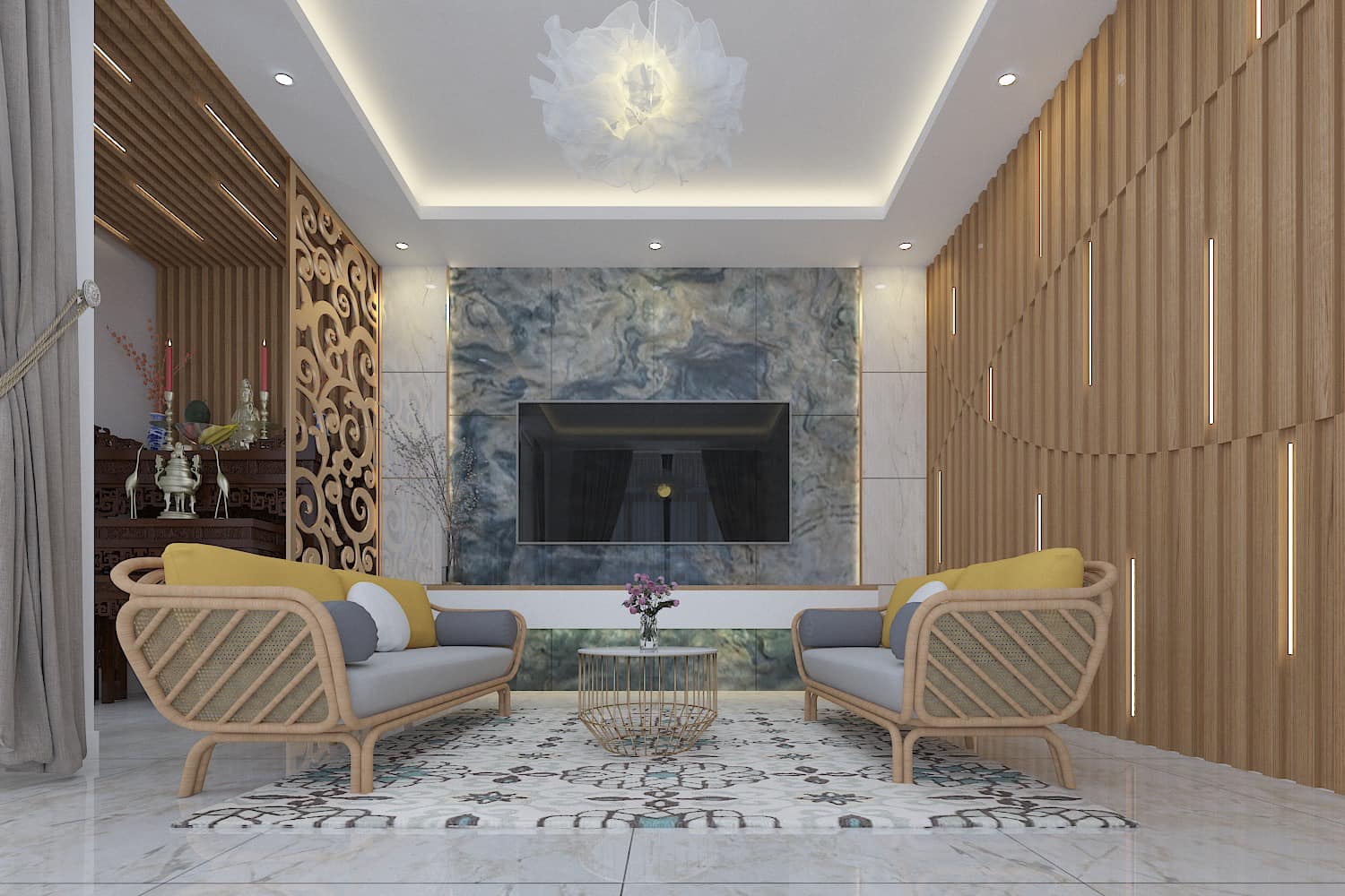 Bên trong nội thất bố trí khá đơn giản nhưng rất hiện đại và đẹp mắt. Phần lồi phía trước làm phòng thờ ốp gỗ trang trí từ sàn lên, trần để làm điểm nhấn, mảng tường phòng khách cũng ốp gỗ trang trí và gắn đèn led trang trí, mảng tường ti vi ốp đá.