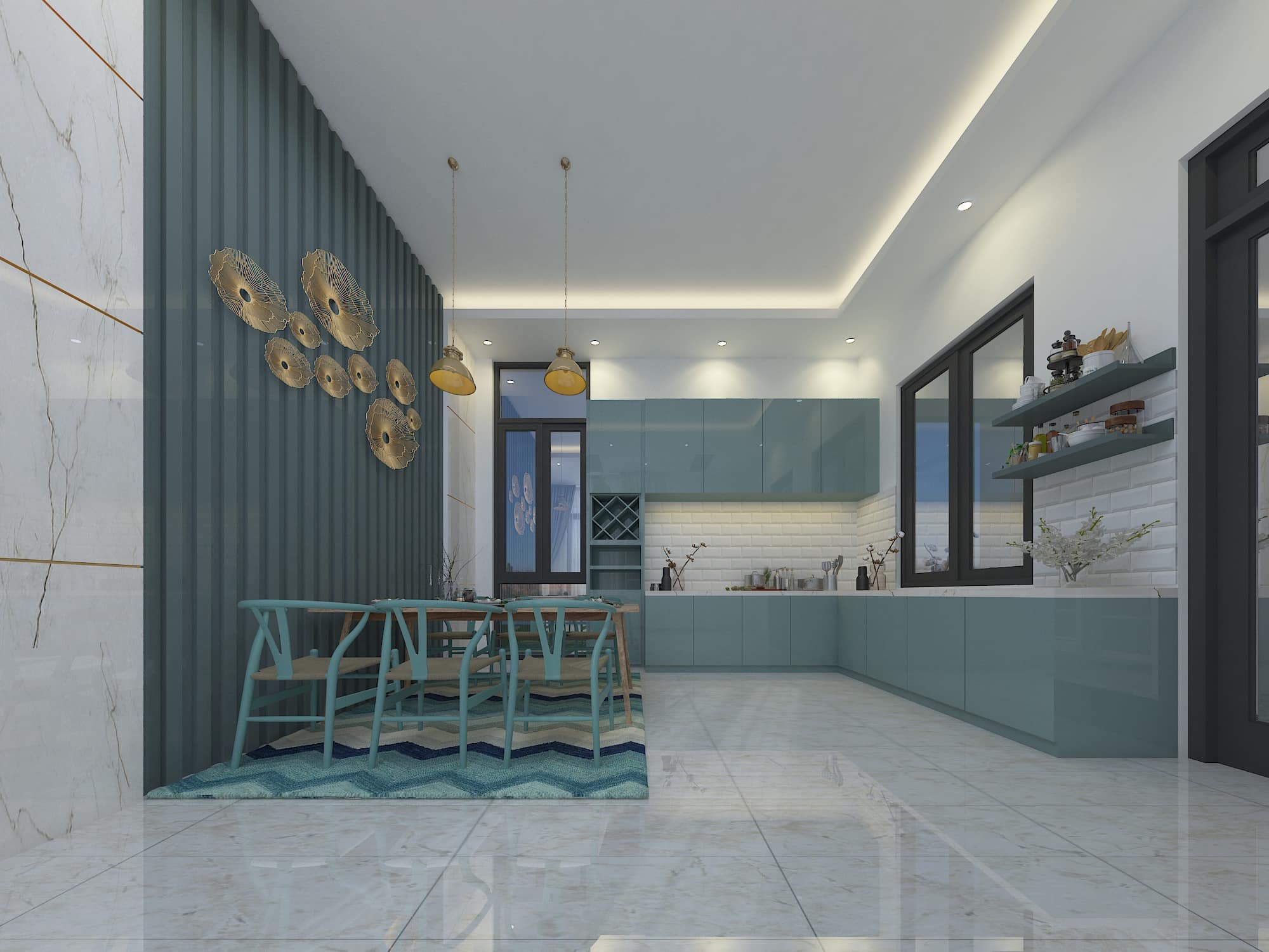 Phía sau bố trí bếp với gam màu xanh ngọc bích và điểm nhấn bằng mảng tường lam cũng sơn màu xanh tạo cho căn bếp rất mát mẻ.