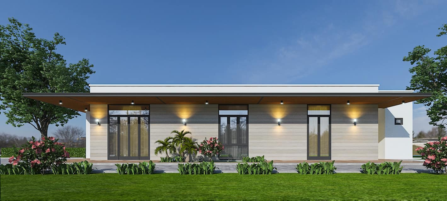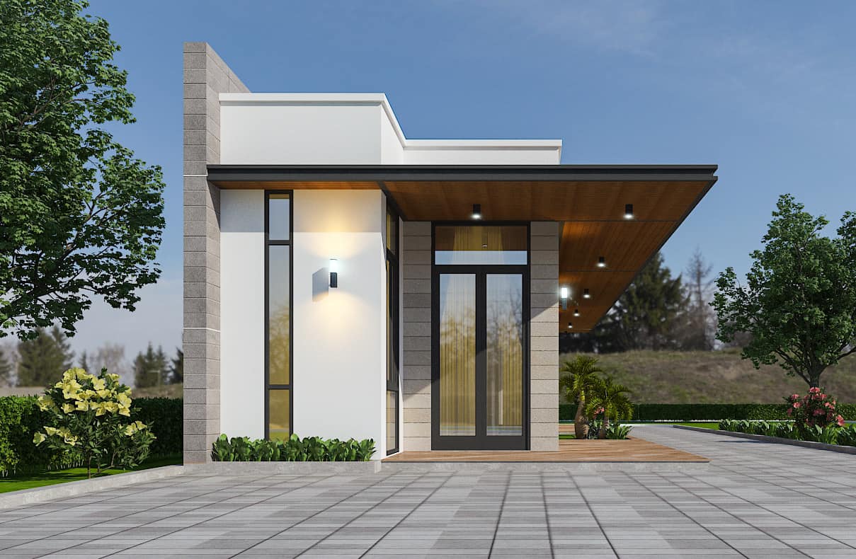 Ngôi nhà cấp 4 hai mặt tiền đẹp được bố trí lớp cửa nhôm xingfa từ sàn đến trần để tận dụng ánh sáng và gió, do thời tiết ở đây mát mẻ quanh năm bên cạnh đó nó cũng làm cho ăn nhà rất sang trọng, hiện đại. Chỗ mái che làm khung thép chữ I phía dưới ốp gỗ conwood ngoài trời.