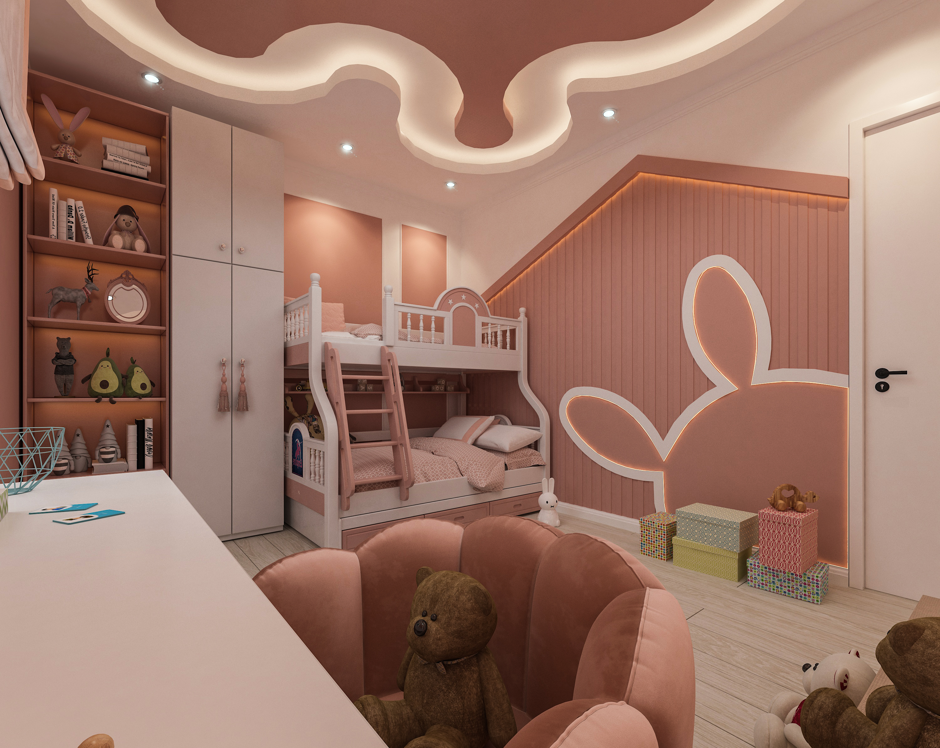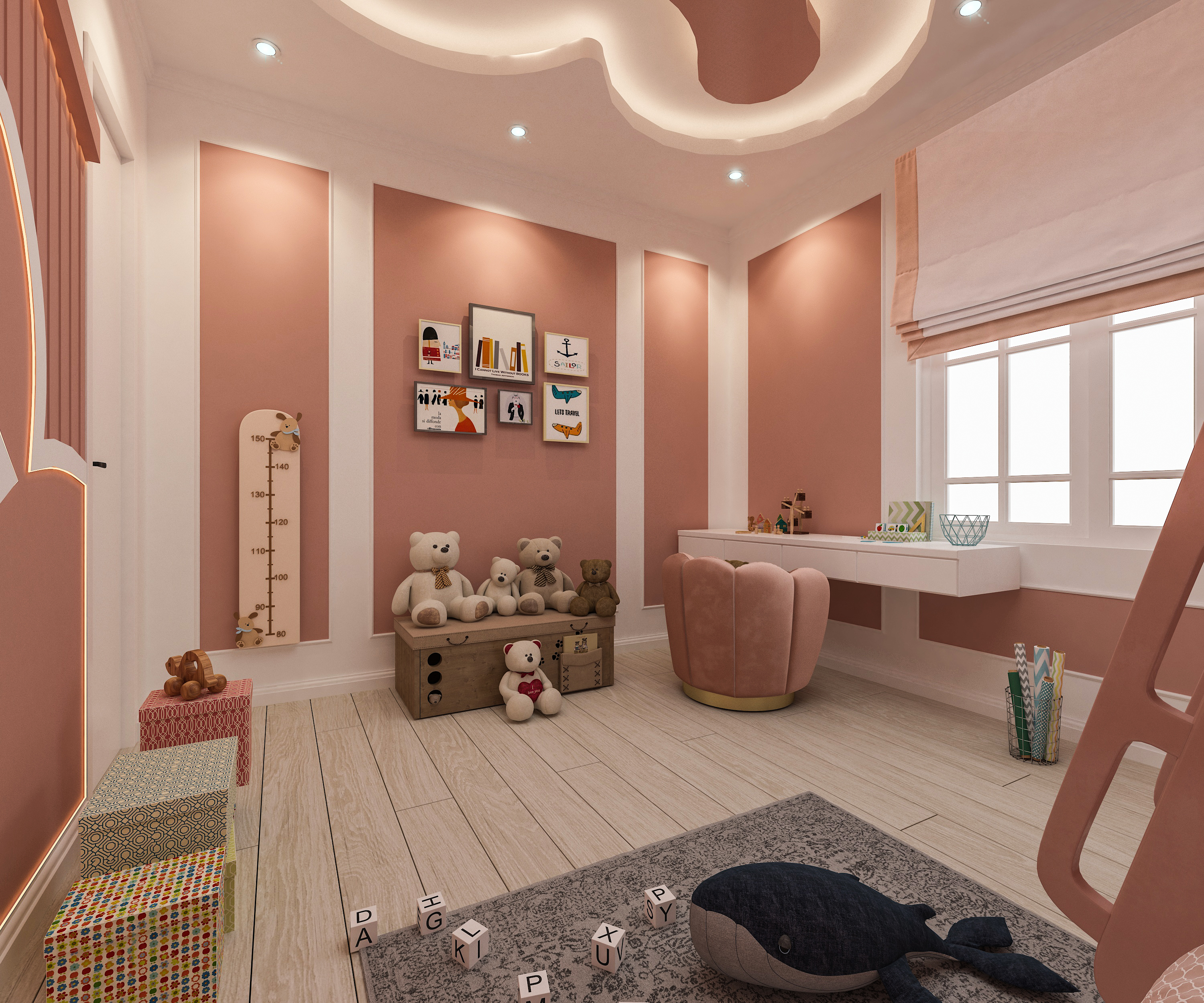 Phòng ngủ con gái với gam màu hồng nhẹ nhàng, đáng yêu.